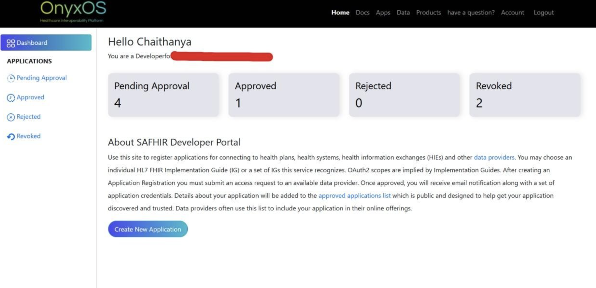 A successful login lands on the developer homepage, where the developer can create a new application request software by submitting details. To create a new application: