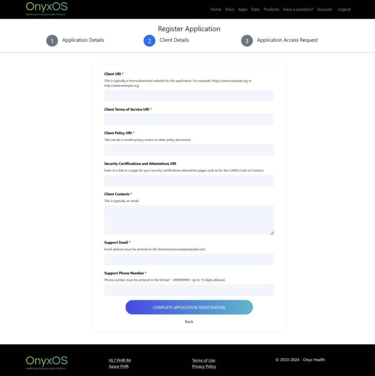 The mandatory fields are: Client URI, Client Terms of Service URI, Client Policy URI, Client Contacts, Support Email, Support Phone Number.