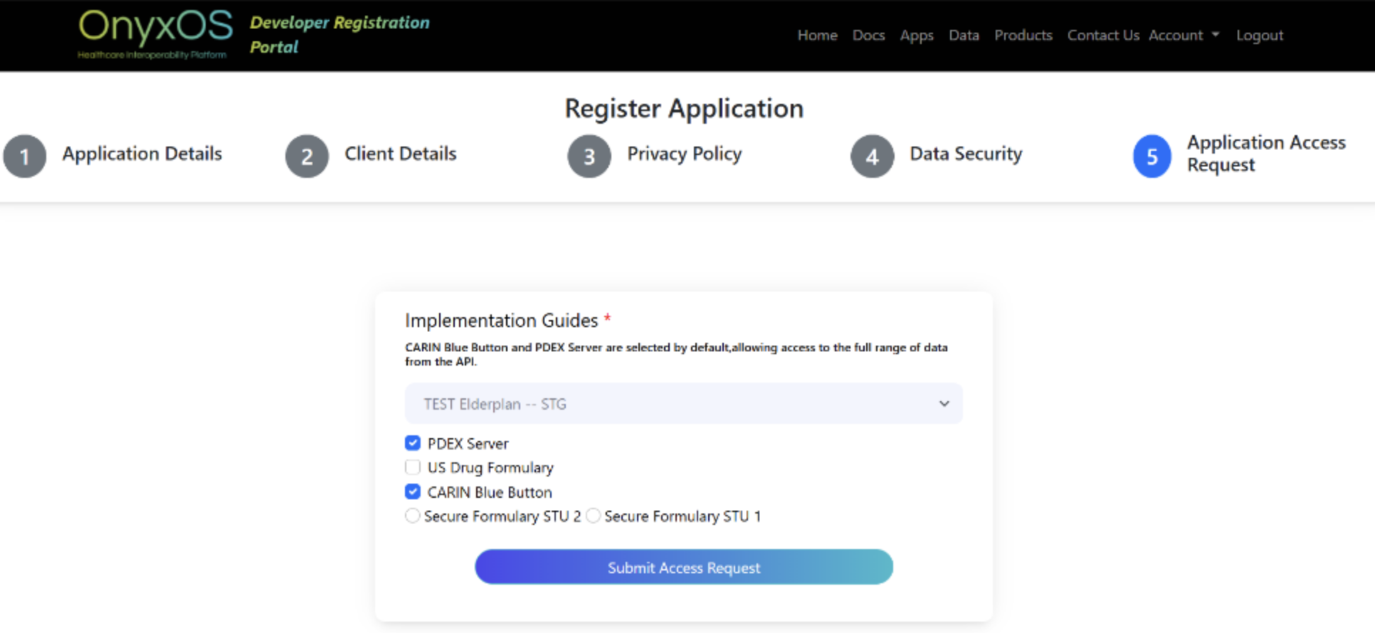 4. Select “TEST Elderplan – STG” as the data provider from the drop-down menu, then click Submit Access Request. Please ensure the applicable implementation guides are selected. (mandatory step)