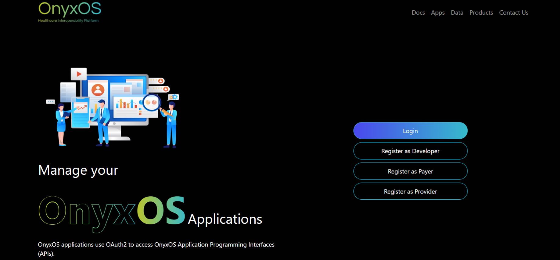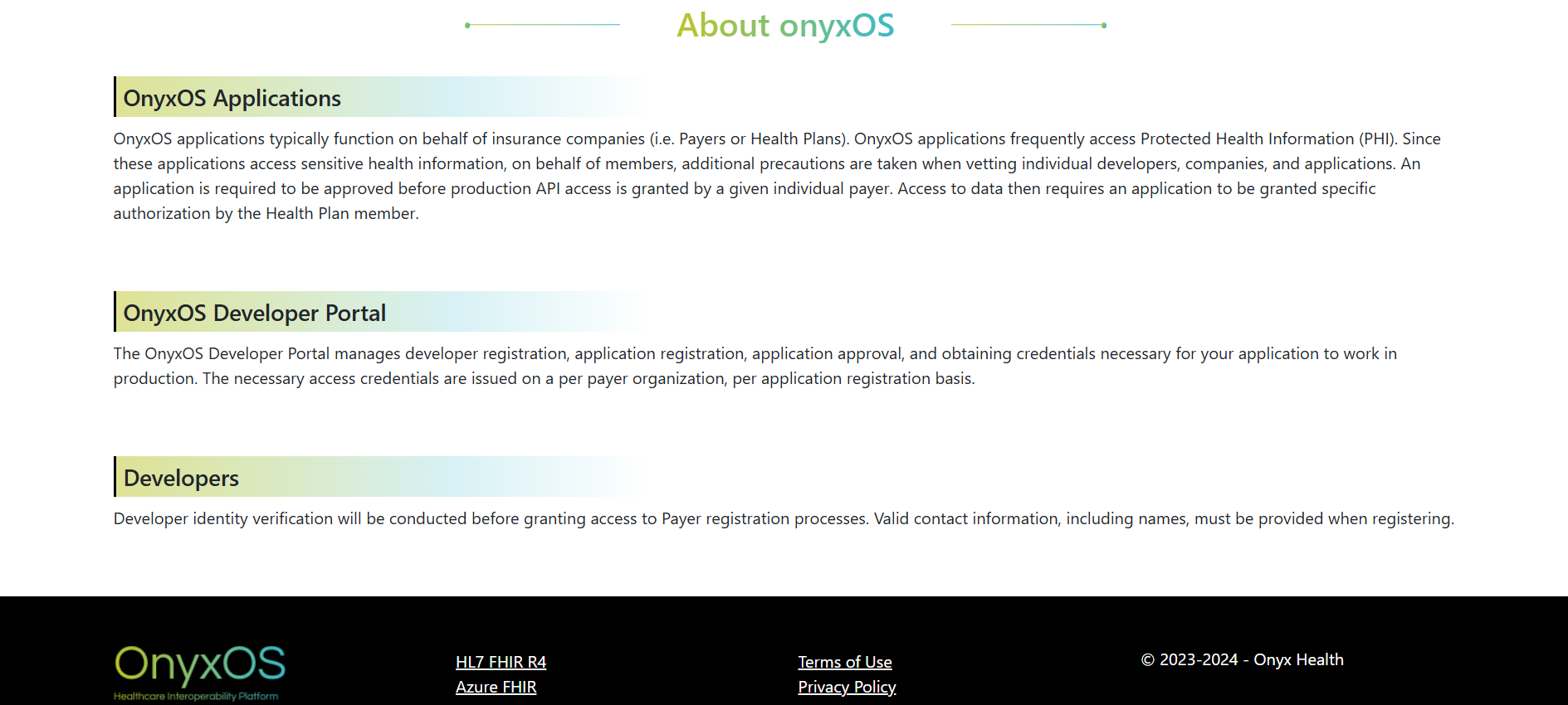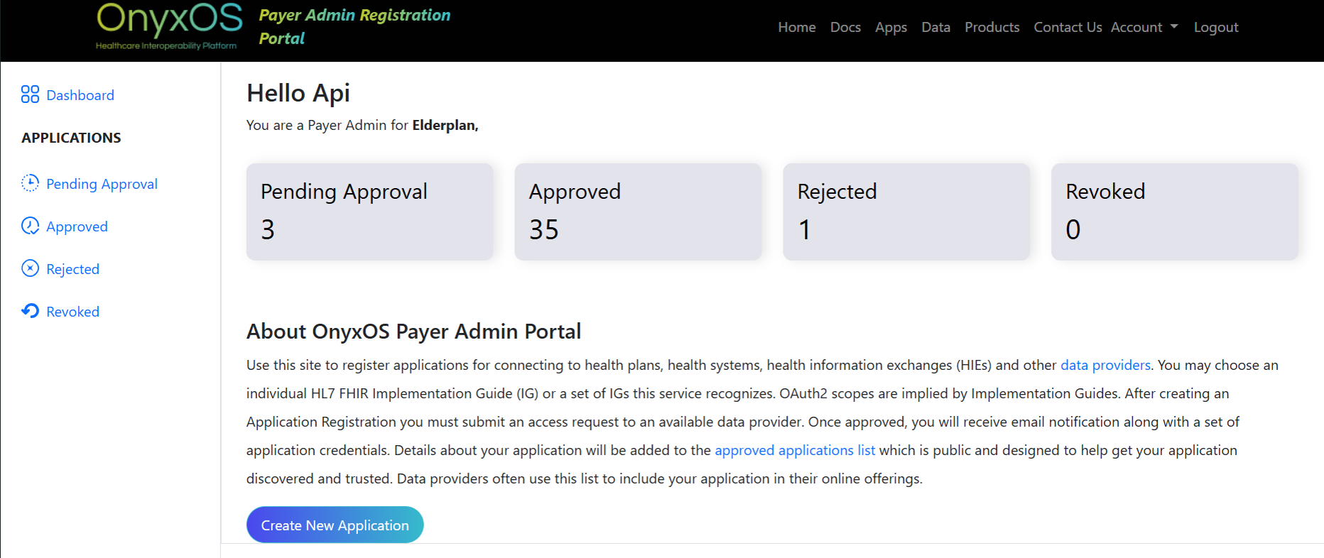 The OnyxOS Developer Portal enables third-party developers to register, manage, and connect their applications securely to Elderplan APIs in compliance with CMS interoperability standards.