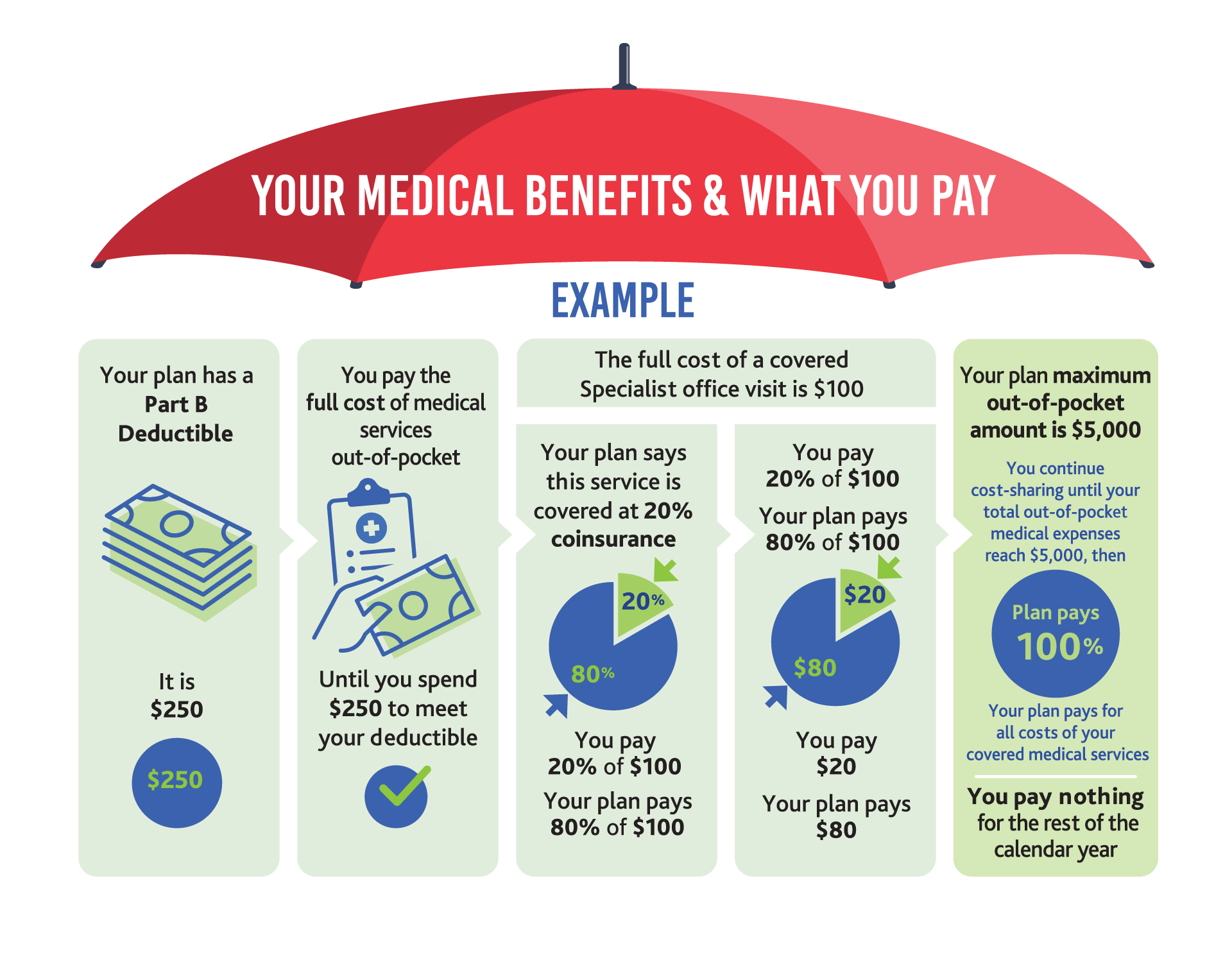 Example: If your Part B Deductible is $283, you pay $283 for your covered services before your Plan begins to pay.